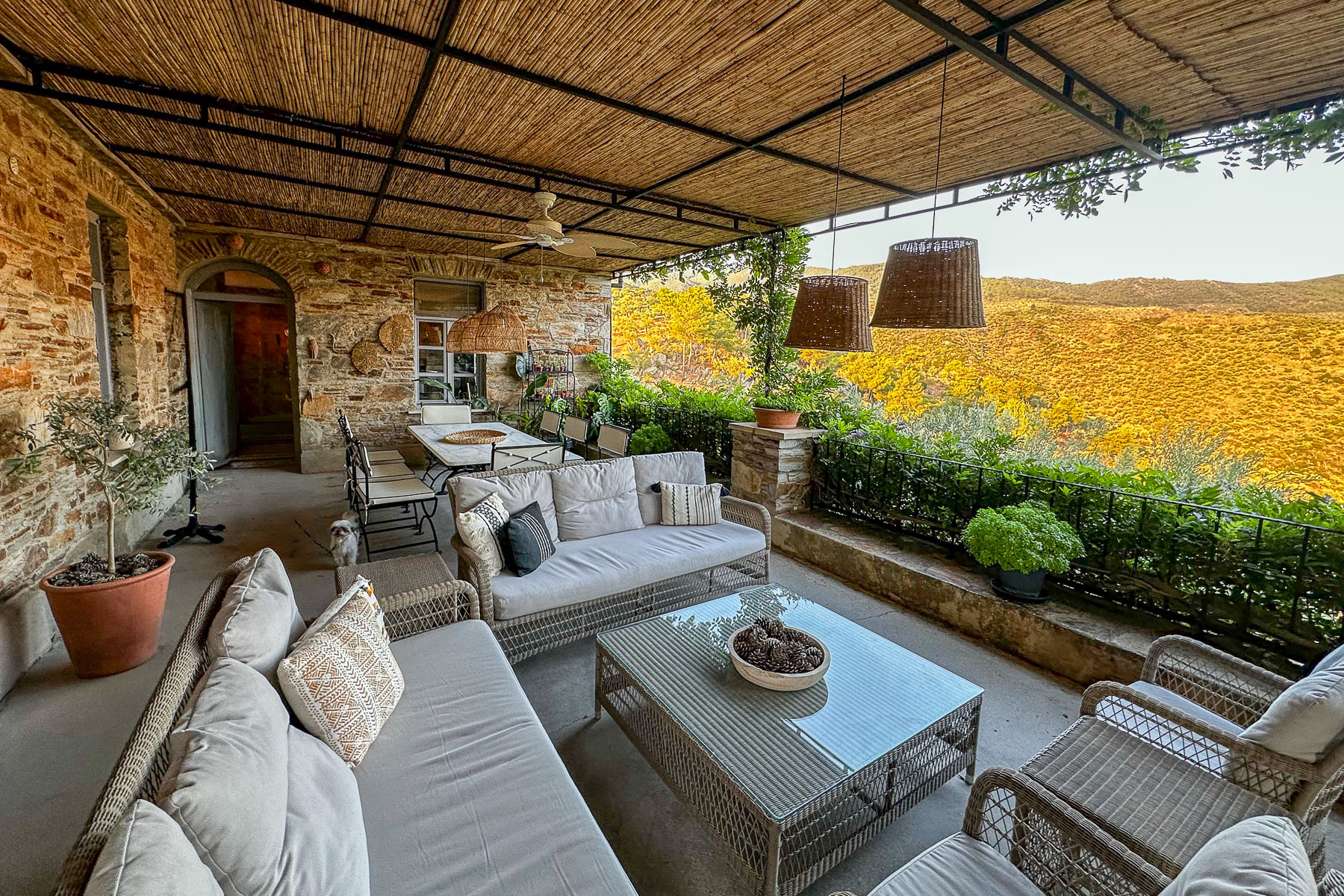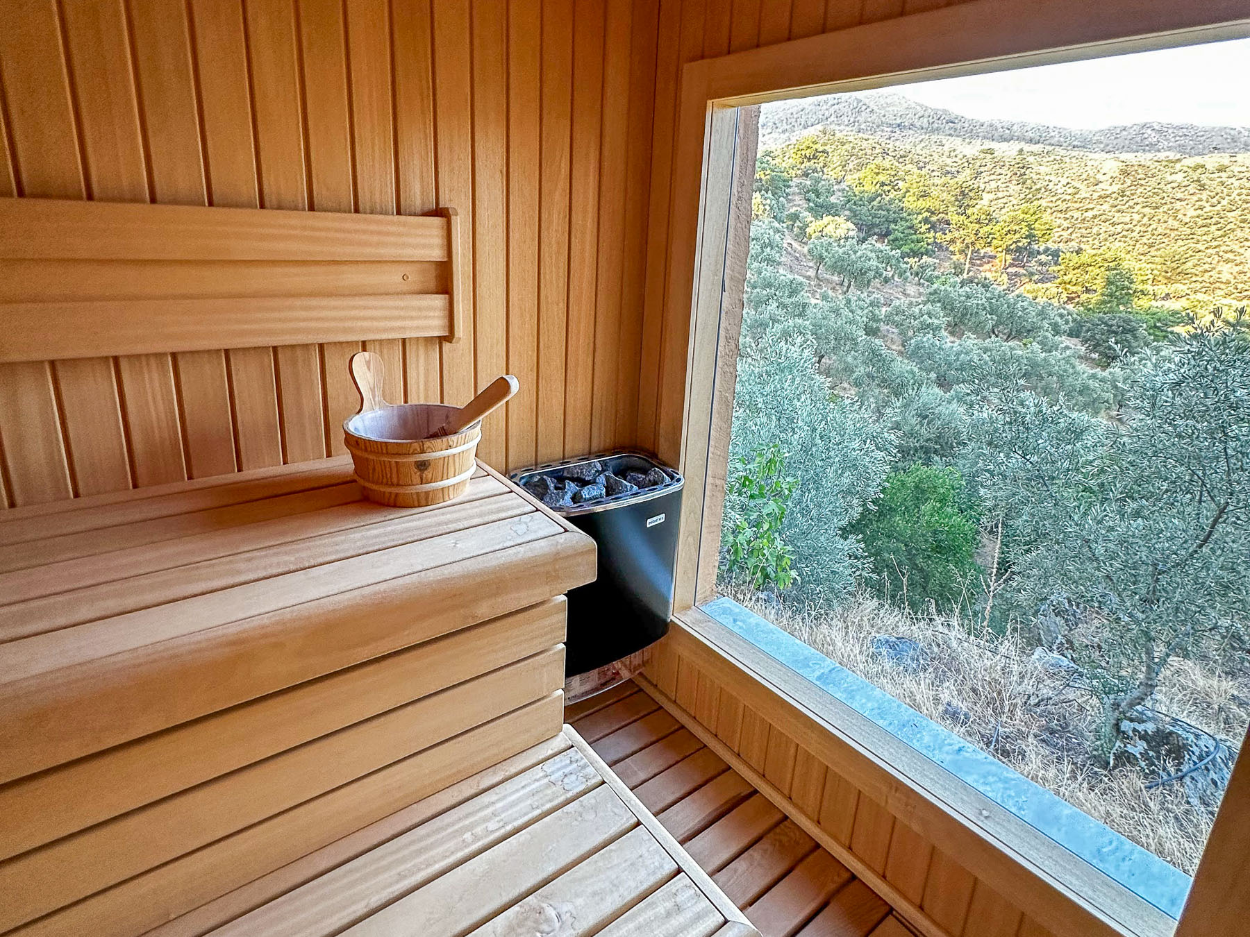 This is a farm accommodation with great amenities like a yoga room, sauna and a pool with a great view.